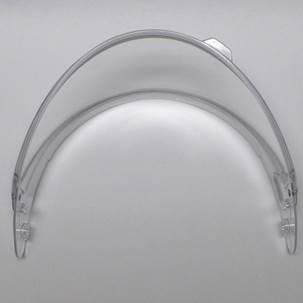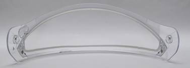 [10] These drawings show the face shield from various angles and perspectives. In them, one can clearly see the shape of the viewing area, which I would describe as rectangular with rounded corners and rounding at the top with tapered ends. The height of the viewing area retreats along the arms.