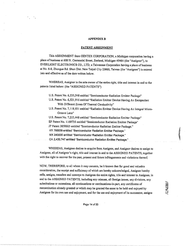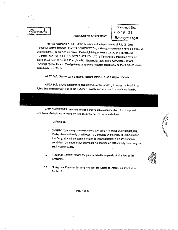 [2] Everlight is a global optoelectronics manufacturer constituted under the laws of Taiwan. On January 23, 2002, Gentex Corporation [Gentex], an American company in the automotive industry, filed an international patent application under the Patent Cooperation Treaty for “radiation emitter devices and method of making the same.” The patent application made its national entry in Canada on June 5, 2003. The Canadian Patent Office issued Canadian letters of patent number CA 2,430,747 [Patent] on May 20, 2008. Following a worldwide transaction between Gentex and Everlight, ownership of several patents were transferred to the applicant. This involved, among other things, an assignment agreement: “Contract No. A03 16070001 Everlight Legal” [Assignment]. On October 13, 2016, the applicant’s patent agent inadvertently filed the complete Assignment to the Patent Office as evidence of the Patent’s transfer of ownership. Yet, Gentex and Everlight had always intended to only submit a more limited appendix (attached as Exhibit C of the affidavit of Hsien-Chia Lin) instead of the entire transaction, in order to protect their confidential information. Registration of the Assignment to the applicant was confirmed by the Patent Office on October 17, 2016. The applicant filed the present application after noticing this error.