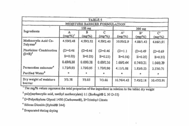 of the moisture barrier dry weight. This would mean the Ranbaxy Ran-Bupropion XL Tablet falls within this range and infringes the 300 Patent based on silicon dioxide alone or if PEG and TEC are included as permeation enhancers.