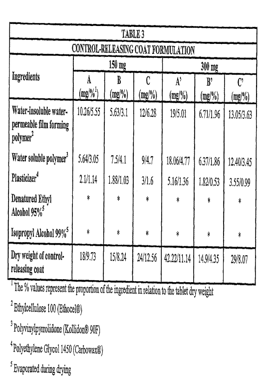 (ii) a first control-releasing coat surrounding said core wherein said first control-releasing coat comprises a water-insoluble water-permeable film-forming polymer, a plasticizer and a water-soluble polymer, wherein the ratio of the water-insoluble water-permeable film-forming polymer to the water-soluble polymer is from about 3:4 to about 5:3; and