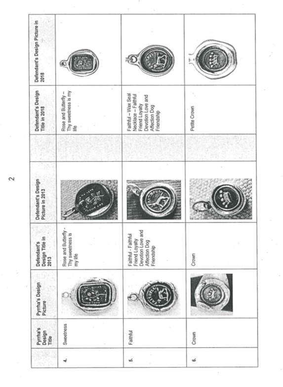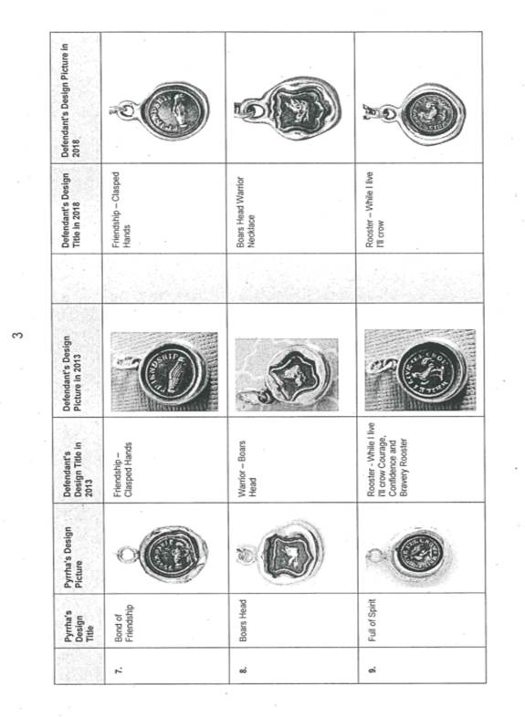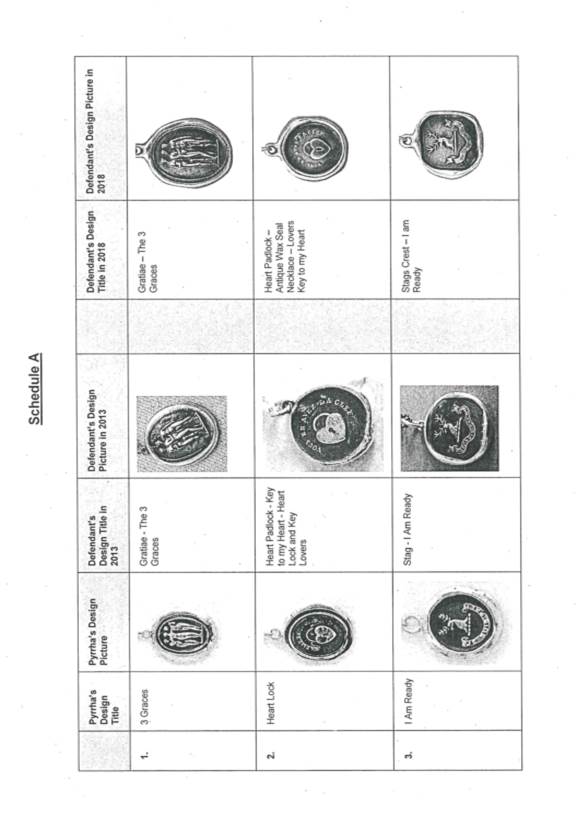 of the Pyrrha Designs. The differences do not appear to be added superficially or in a way that suggests Hardy was camouflaging her alleged imitation. The differences are more plausibly the result of using similar (but not identical) imagery from separate sources (each party’s own collection) but choosing to modify and finish the jewellery in a slightly different way.