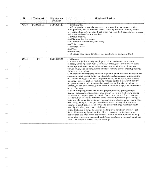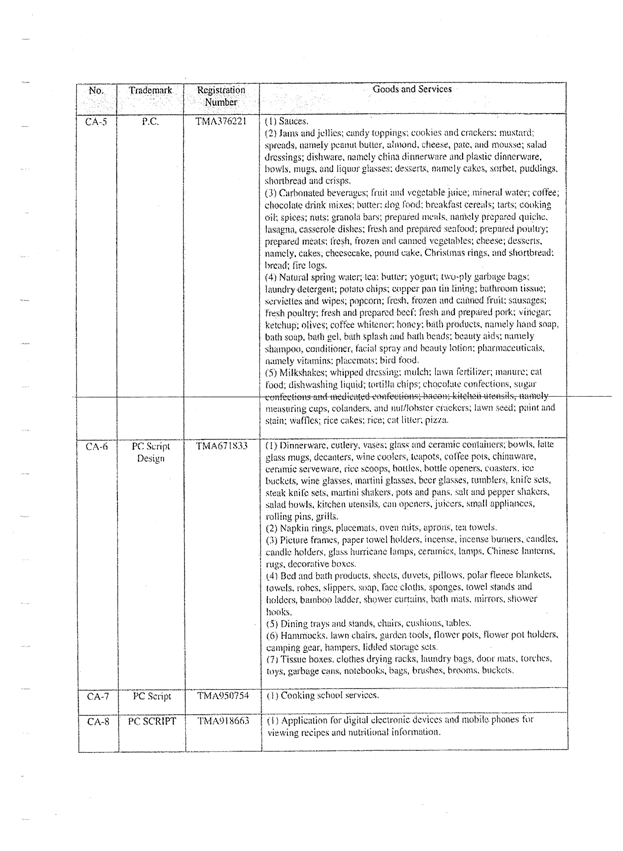 1. the word mark PC, registered in relation to (1) food and kitchenware products, and (2) the operation of a reward incentive program for points which can be redeemed for various products [the PC Word Mark];