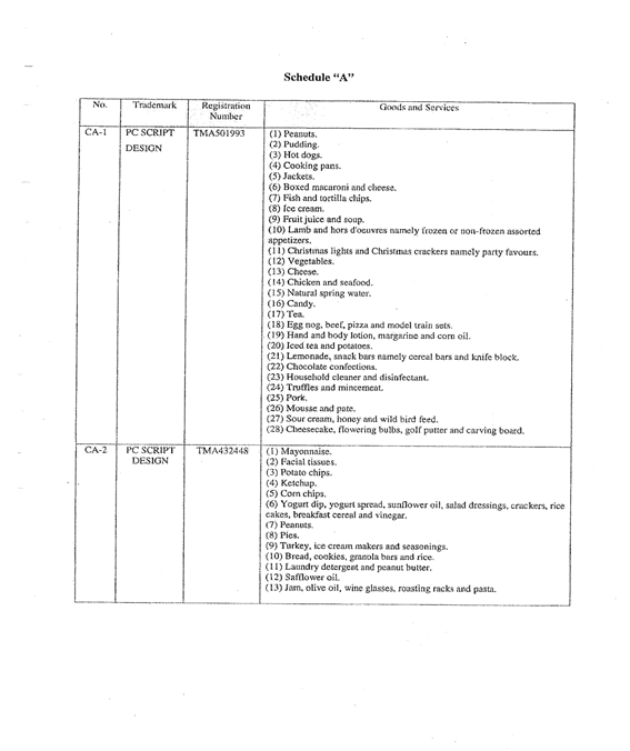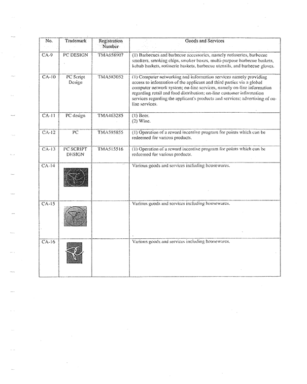 2. the design mark, registered in relation to (1) food and kitchenware products and (2) the following services: cooking school services, application for digital electronic devices and mobile phones for viewing recipes and nutritional information, and the operation of a reward incentive program for points [the PC Script Mark]; and