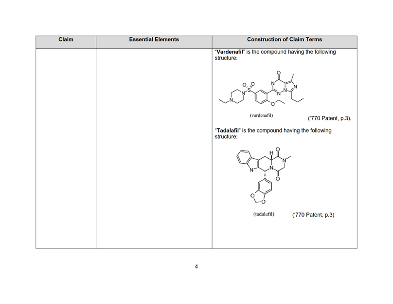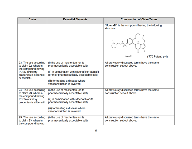 to be a compound that meets or exceeds a threshold measurement of its ability to inhibit PDE5 according to an experimental test protocol described in the patent. Examples of such compounds are sildenafil, vardenafil, tadalafil, and udenafil. Some of the Asserted Claims do not include a limitation on the PDE5-I, and others are limited to: the four example PDE5-Is, sildenafil or tadalafil, sildenafil specifically, or tadalafil specifically.