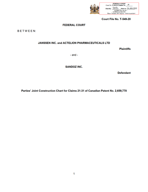 [1] The plaintiffs, Janssen Inc. (Janssen) and Actelion Pharmaceuticals Ltd (Actelion), bring this patent action against Sandoz Canada Inc. (Sandoz) pursuant to subsection 6(1) of the Patented Medicines (Notice of Compliance) Regulations, SOR/93-133 [PMNOC Regulations], made under the Patent Act, RSC 1985, c P-4 [Patent Act].