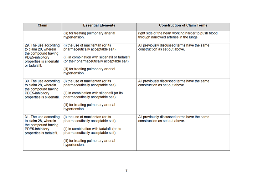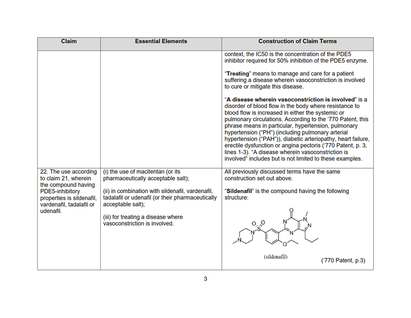 [6] The 770 Patent relates to macitentan in combination with a PDE5-I to treat diseases wherein vasoconstriction is involved, including PAH. Claim 21 is an independent claim of the 770 Patent that claims the use of macitentan in combination with a PDE5-I to treat a disease wherein vasoconstriction is involved. The other Asserted Claims depend directly or indirectly on claim 21 and they are narrower in scope. The dependent claims include limitations on the specific PDE5-I, the specific disease, or both.