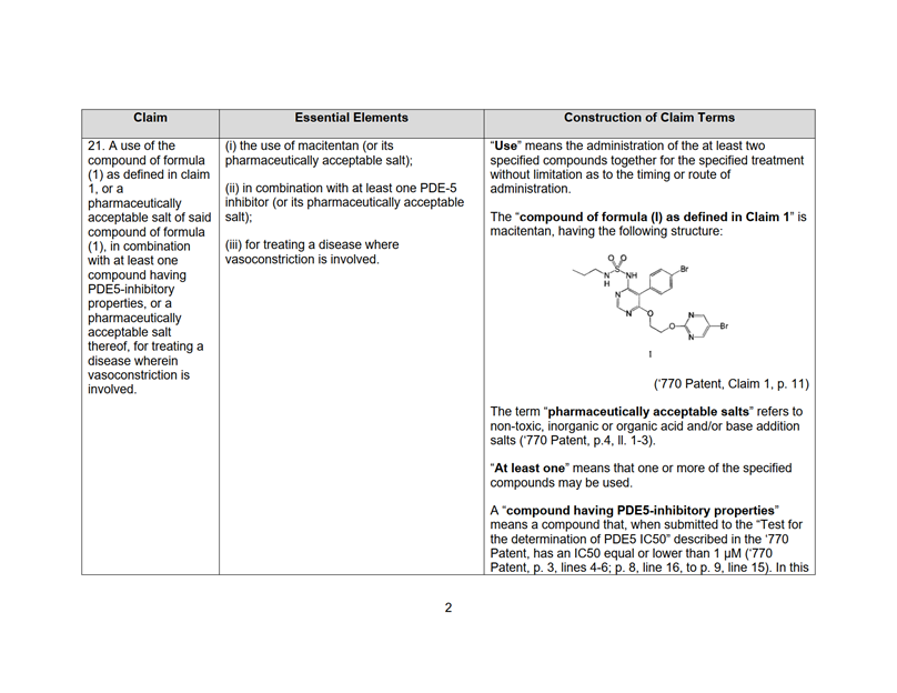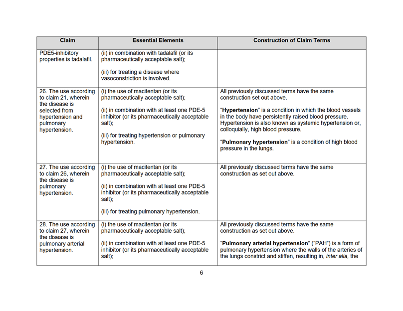 [18] The first paragraph of the 770 Patent specification describes the invention as relating to a product containing a compound of formula (I) in combination with at least one compound having PDE5-inhibitory properties for therapeutic use in the treatment of a disease wherein vasoconstriction in involved. Some of the Asserted Claims do not include a limitation on the disease, while others are limited to: hypertension and pulmonary hypertension (PH), PH specifically, or PAH specifically.