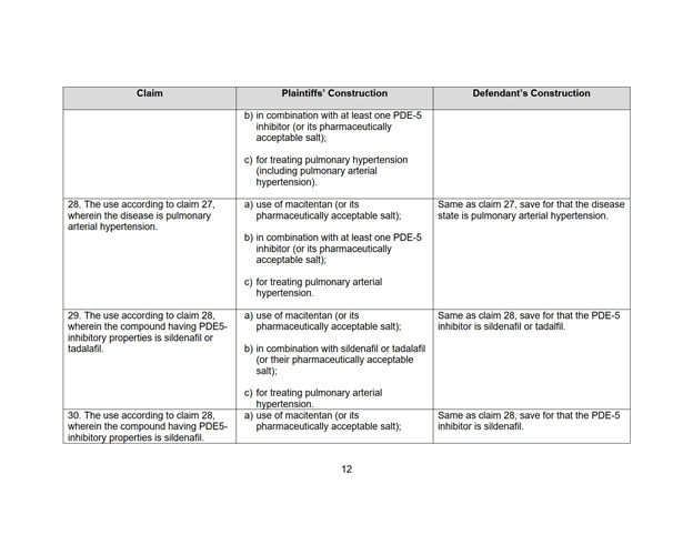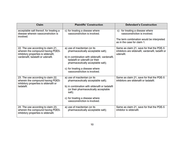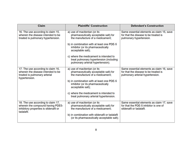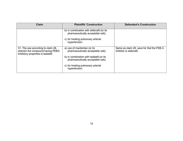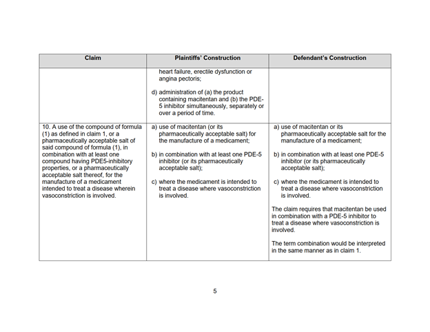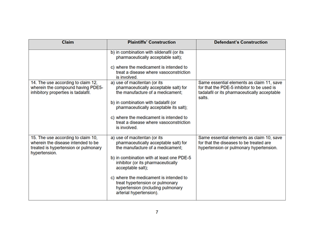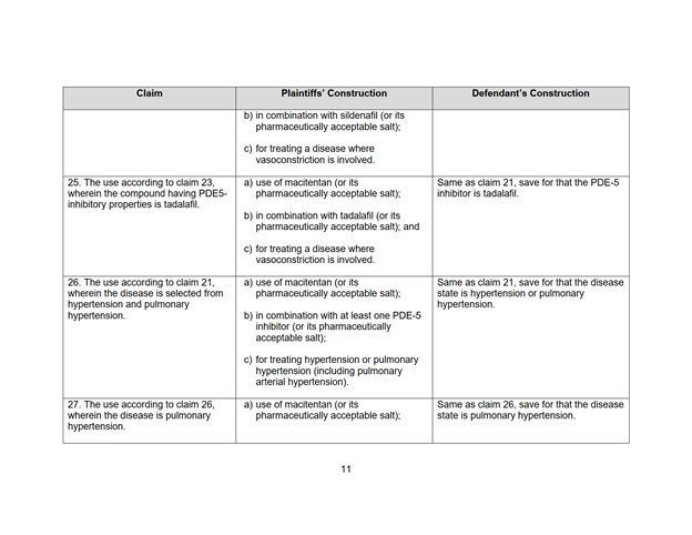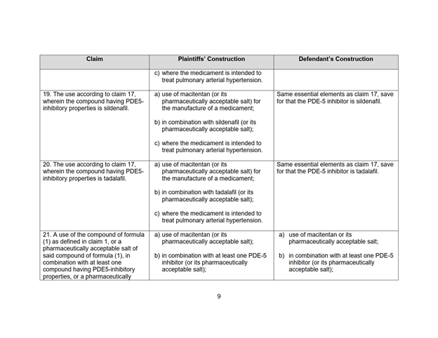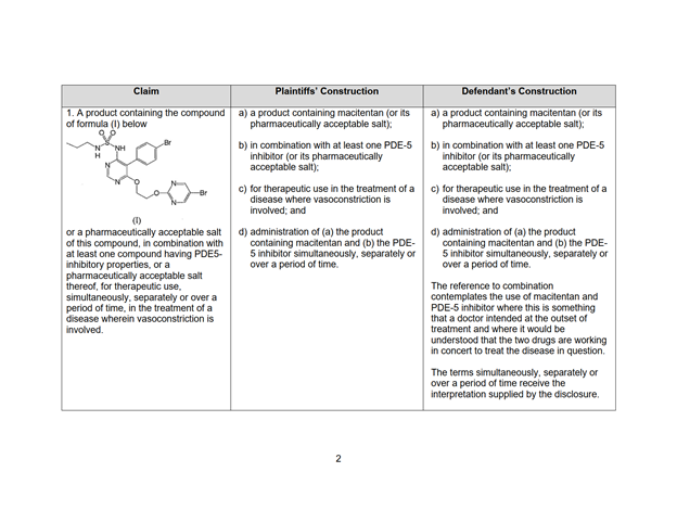 [27] The parties filed a joint claim chart. Despite their identical proposed constructions of the essential elements of the Asserted Claims, the parties do not agree on what the claims mean. Two aspects of claim construction are in dispute: (i) whether claims 1, 10 and their dependent claims are, in substance, claims to the use of macitentan to treat a disease including PAH; and (ii) for all Asserted Claims, whether “combination”