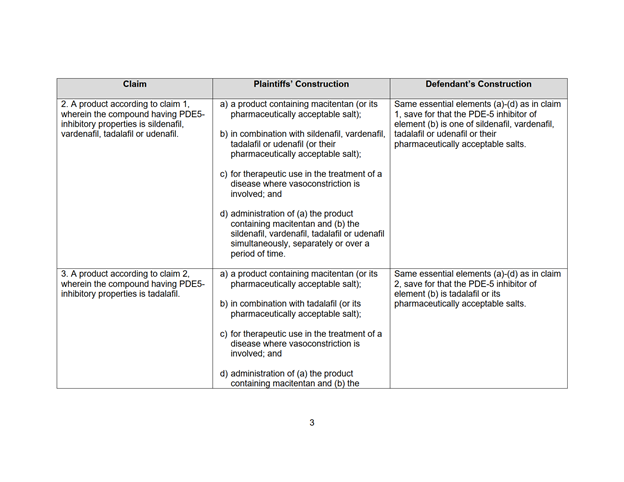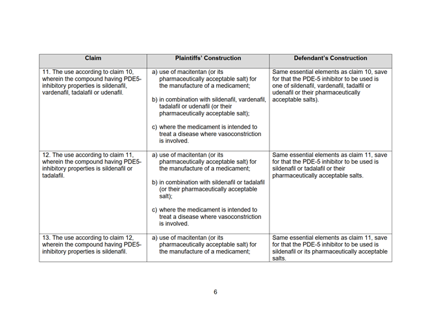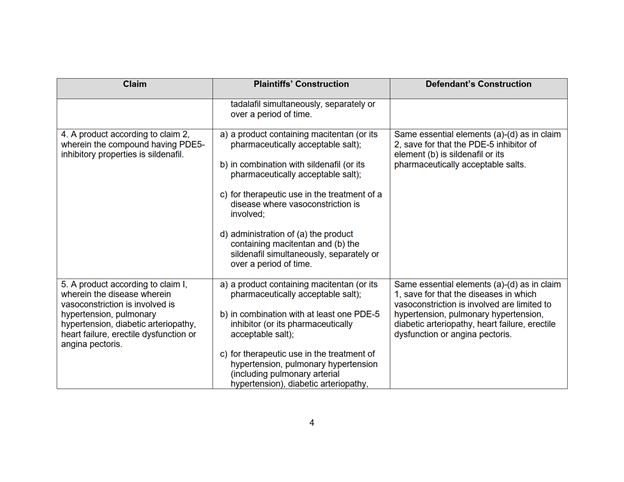 to be a compound that meets or exceeds a threshold measurement of its ability to inhibit PDE5 according to an experimental test protocol described in the patent, and it provides four examples of PDE5-Is: sildenafil, vardenafil, tadalafil, and udenafil. Some of the Asserted Claims do not include a limitation on the PDE5-I, and others are limited to: the four example PDE5-Is, sildenafil or tadalafil, sildenafil specifically, or tadalafil specifically.