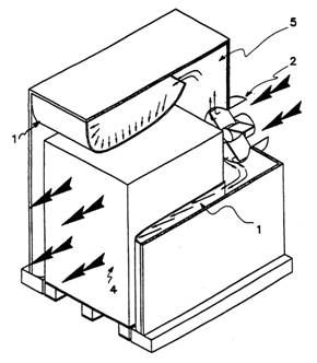 – The upstream edge (1A) of the tarpaulin (1) is kept away from the surface (5A) of the tunnel (5) that it covers, so that air can be blown into the space between the tarpaulin and the tunnel surface, pressing the tarpaulin (1) against the stack of products on the pallet (4).