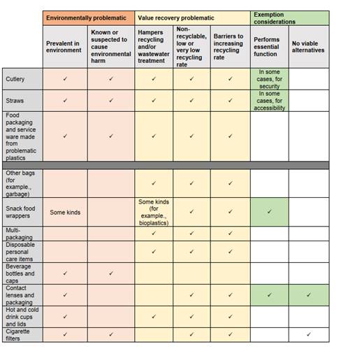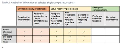 and identified six plastic items that met the requirements of a ban or a restriction (plastic checkout bags, stir sticks, six-pack rings, cutlery, straws, and food service ware made from problematic plastics).