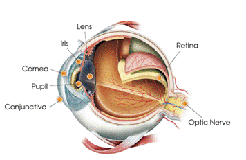 (a)Cornea: The eye’s front surface (a clear dome over the iris), the cornea covers the iris, pupil, and anterior chamber. The cornea is responsible for approximately 70% of the total focusing ability of the eye;