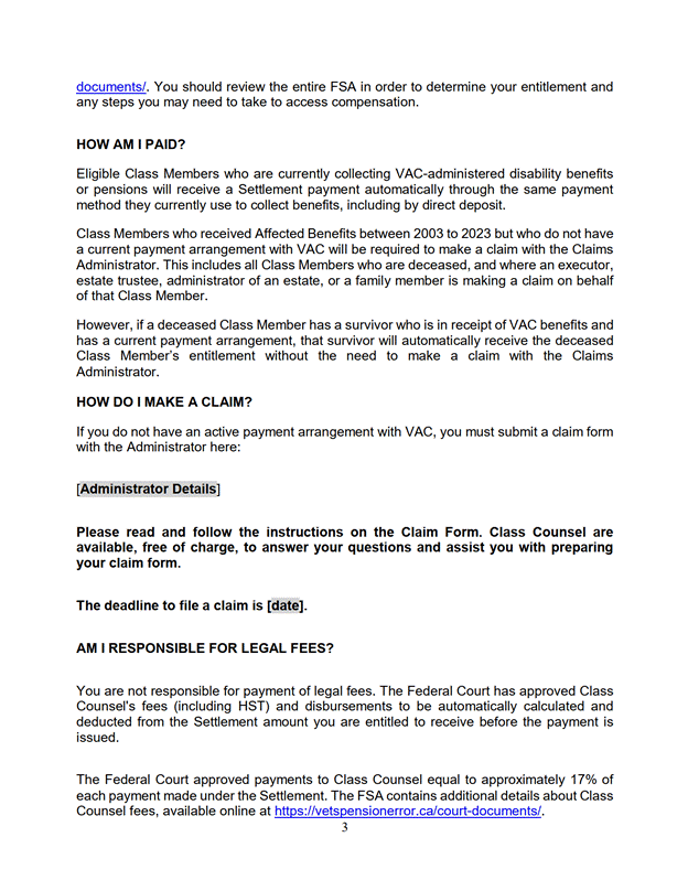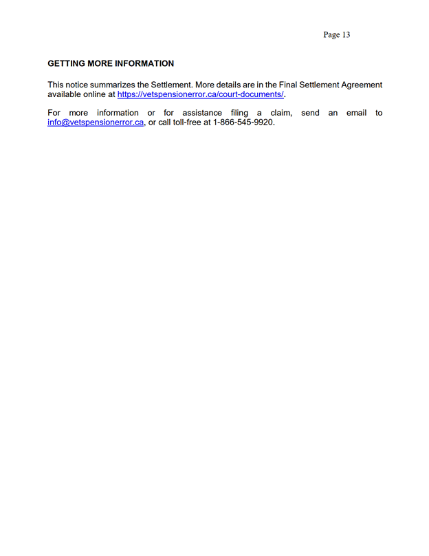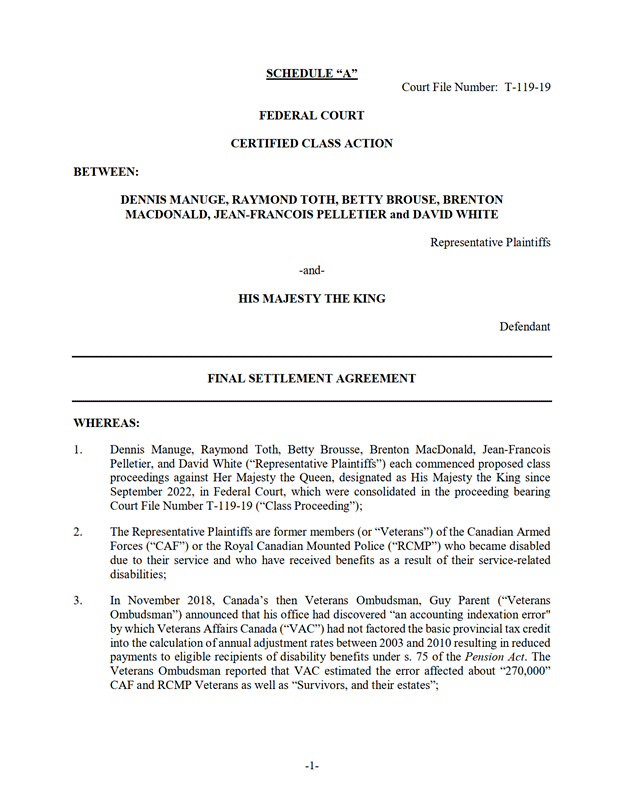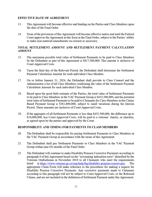[2] In general, the FSA addresses an alleged miscalculation and resulting underpayment of disability pension benefits for members and veterans of the Canadian Armed Forces [CAF] and the Royal Canadian Mounted Police [RCMP] and their spouses, common-law partners, dependents, survivors, or estates. In 2018, the Minister of Veterans Affairs Canada [VAC] acknowledged a miscalculation of the provincial tax credits to the wage rate that resulted in lower payments to eligible recipients of certain pension benefits. The total amount of the underpayment was estimated at $165 million. VAC allocated $165 million to make “Corrective Payments”