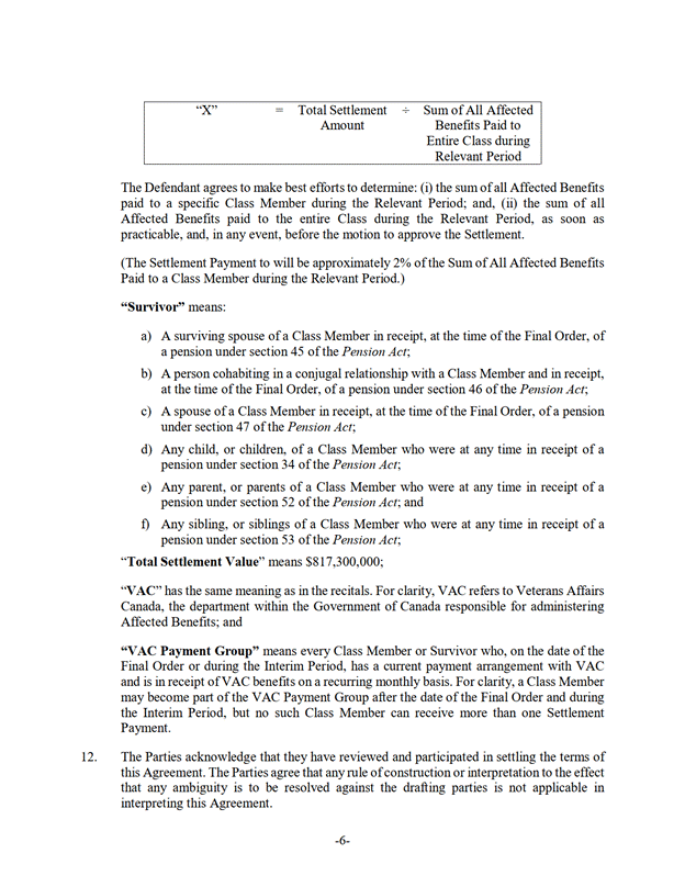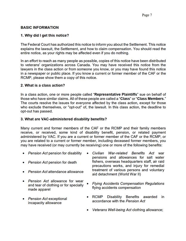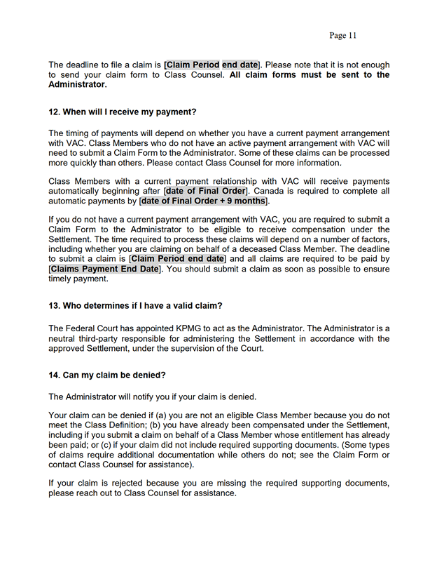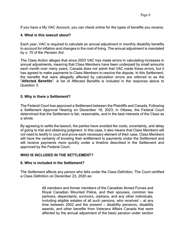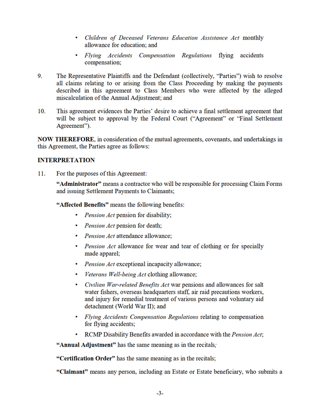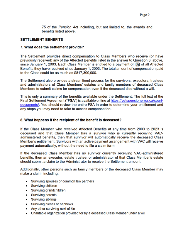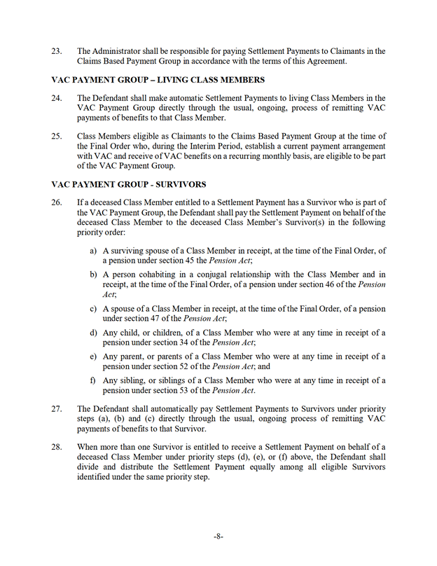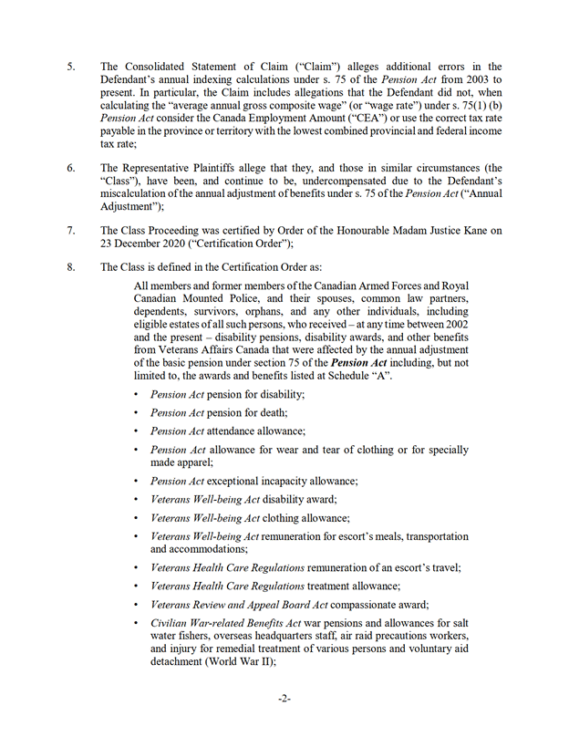 [32] Class Counsel also discovered that compassionate awards, previously listed as a separate Affected Benefit in the Certification Order, were paid as disability pensions under the Pension Act and had already been included as Affected Benefits.
