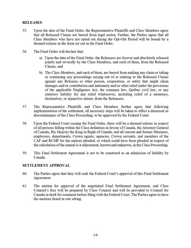[5] The documents attached to these Reasons and Order, including the FSA, provide more extensive details. The FSA is the result of negotiations based on the knowledge and understanding of Class Counsel and the Defendant, with the assistance of expert actuarial evidence regarding how various benefits were affected by the calculation errors. The expert report, prepared by Mr. Alexander MacLeod, explains the methodology and the formula that will be applied to calculate the amount to be paid to address the underpayments based on the identified errors.