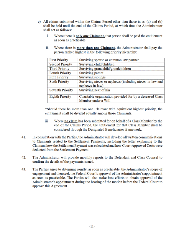 [88] The Class Members in the Claims Based Payment Group must be notified of their eligibility (if they are not already aware) and must proactively make a claim, to be assessed by the Administrator. The legal fees and disbursements will also be deducted on a pro rata basis. However, there is considerable uncertainty regarding how many members of the Claims Based Payment Group will submit claims. There is also considerable uncertainty with respect to the total amount of fees and disbursements to be paid to Class Counsel, as this is contingent on their and others’ ongoing efforts to reach out to eligible Class Members and assist them to make their claims.