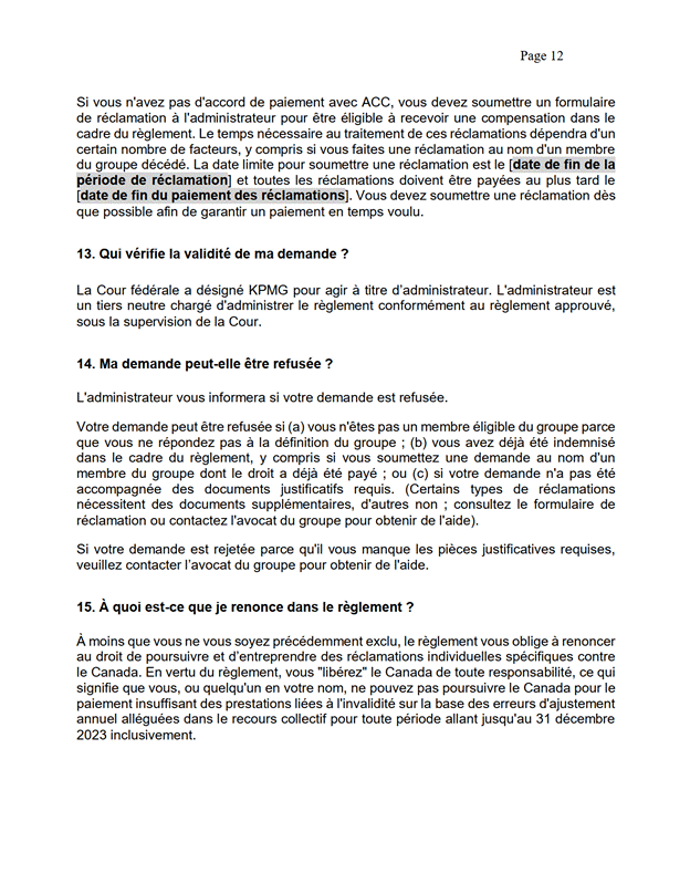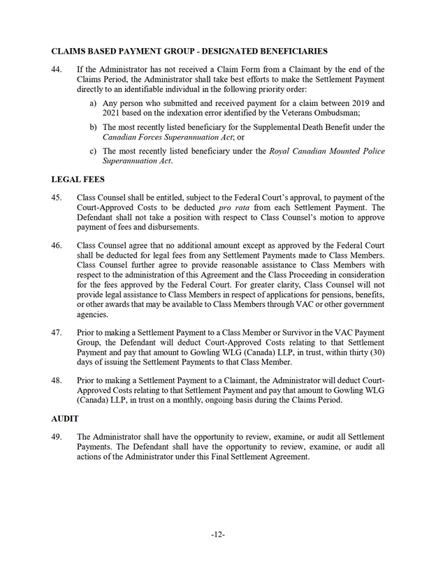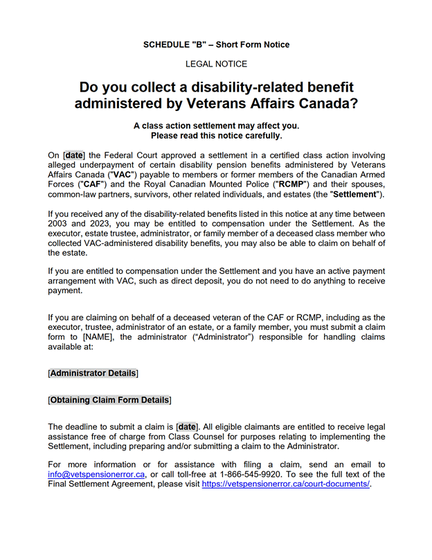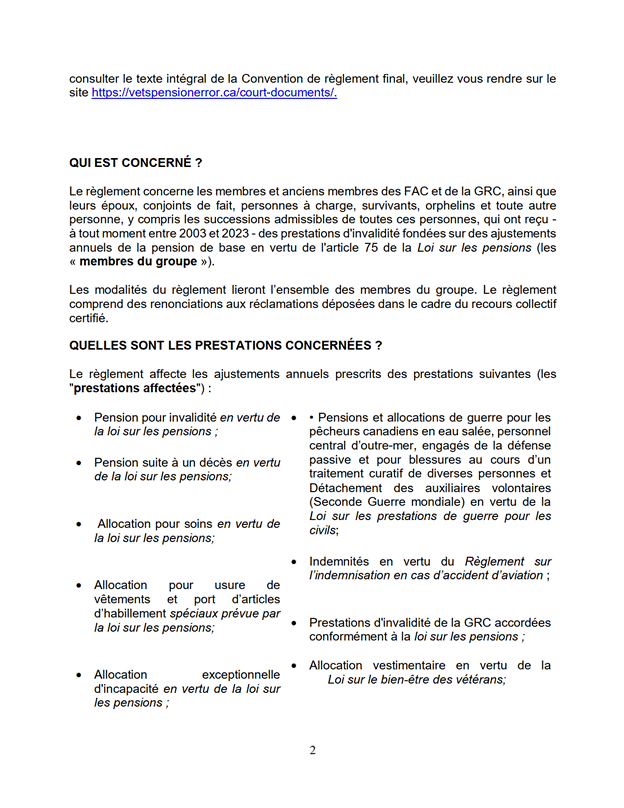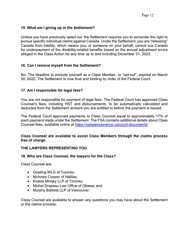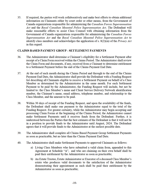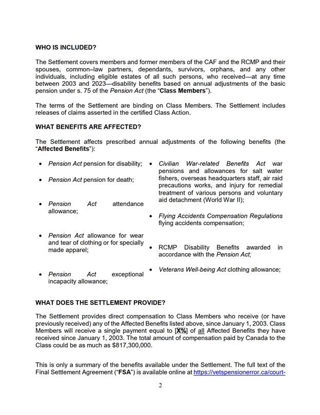 [26] As noted, the settlement arises out of and resolves a miscalculation of disability pension benefits for members and veterans of the CAF and the RCMP and their spouses, common-law partners, dependents, survivors, orphans, or estates.