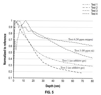 [582] In my view, the inventors had experimental results that showed (a) a flowability difference between Tests 1 and 2 on the one hand and Tests 3 and 4 on the other; (b) ToF-SIMS oxygen profiles that could be distinguished on the basis of where the oxygen concentration passed the 50% of maximum concentration. As can be seen in Figure 5, Tests 1 and 2 pass the 50% mark below 30 nm, while Tests 3 and 4 pass that mark above 60 nm. While the depth measurements may be only an approximation (apparently done by Polytechnique Montréal at the time), I am not satisfied that this approximation was unreasonable or results in the data being entirely unreliable: Transcript, Day 10, pp 32–33; Day 11, pp 137–138; ’236 Patent, para 179*; Exhibit 124, p 2; Confidential Transcript, Day 8, p 98.