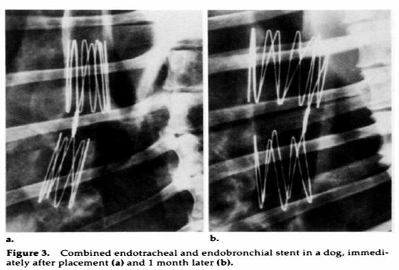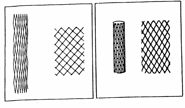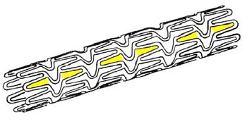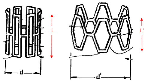 [25] In 1984, Maass et al. reported the use of spiral-shaped stents made of heat-treated steel alloy, configured as a double-helix spiral, torsion-reduced in diameter and transluminally inserted in the vena cava or aorta of dogs or calves. When wound tightly, the springs became narrow in diameter to allow them to be delivered into and through the lumen. Once released, they sprang back to their original size whereupon they pressed themselves against the vessel wall by elastic expansion.