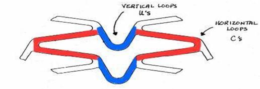 [423] Each closed cell of the NIR stent is formed by a pair of opposite-facing horizontal or longitudinal “C” loops and a pair of vertical or circumferential “U” loops. One individual cell (with its components color coded) is set out below: