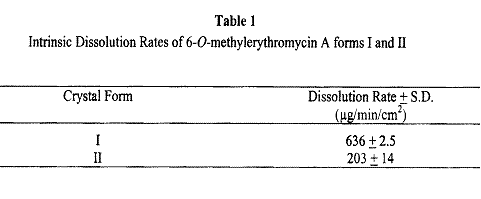Drugs currently on the market are formulated from the thermodynamically more stable Form II crystals. Therefore, preparation of the current commercial entity requires converting the Form I crystals to Form II. Typically this is done by heating the Form I crystals under vacuum at a temperature greater than 80oC. Therefore, the discovery of a novel form of 6-O-methylerythromycin A which can be prepared without the high temperature treatment results in substantial processing cost savings. In addition, the favourable dissolution characteristics of Form I relative to Form II increases bioavailability of the antibiotic and provides significant formulation advantages.