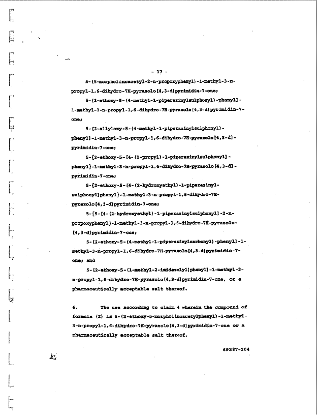 …Furthermore, in the claims only two compounds of the preferred group are selected for individual claiming. Sildenafil is one, and is claimed in Claim 7. A skilled person would understand that sildenafil is one of two compounds that the inventors thought to be most important for the treatment of erectile dysfunction.