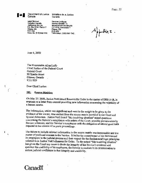 [2] On June 4, 2009, Senior General Counsel for CSIS wrote to the Chief Justice of the Federal Court acknowledging that “the failure to include relevant information in the source matrix was inexcusable and is of profound concern to the Service…”. (See letter of June 4, 2009 attached as Appendix 2)