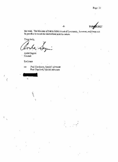 [6] The three witnesses chose to attend before the Court to explain their actions. They were represented by independent lawyers who were given access to all relevant information. The three witnesses were examined by their counsel and cross-examined by counsel for the Attorney-General and by Mr. Cavalluzzo, a special advocate. Independent counsel were also given an opportunity to re-examine their clients.