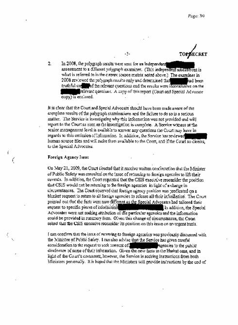 [9] Documents were filed by the three witnesses and by the Attorney General. One of these documents was a CSIS report dated June 2009 (the “internal report”) prepared by a senior member of CSIS at the request of the CSIS executive. This report was characterized by CSIS as one of the measures taken to deal with the failure to provide full disclosure of the polygraph information to the Court (see CSIS Senior General Counsel letter dated June 4, 2009 to the Chief Justice, Appendix 2).