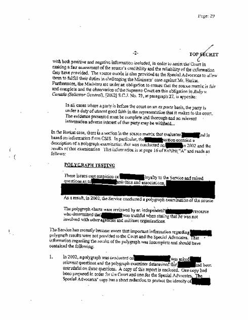 [21] In the source matrix found in Exhibit “A” to the closed portion of this proceeding there is a section entitled “polygraph testing” which discusses the administration of a polygraph to one of the human sources relied on by CSIS. In the September 2008 version of the matrix, the polygraph section stated: