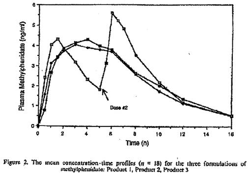 125. The above graph shows the pharmacokinetic profile for two doses of Ritalin (given at time zero and again at 5 hours and shown as the open squares). As can be seen, the first dose of Ritalin results in a rapid ascent in plasma concentration that peaks just before two hours, and then falls rapidly until the second dose of Ritalin is given. According to the definition of "sustained-ascending methylphenidate plasma concentration" adopted by Drs. Patrick, Angst, Davies and Quinn, Ritalin achieves a sustained ascending methylphenidate plasma concentration for almost two hours (the peak of the first dose of Ritalin).