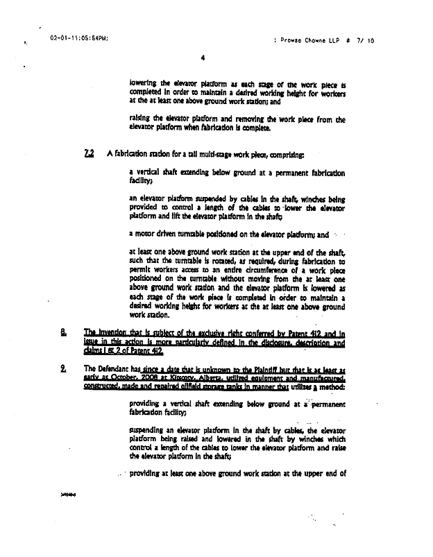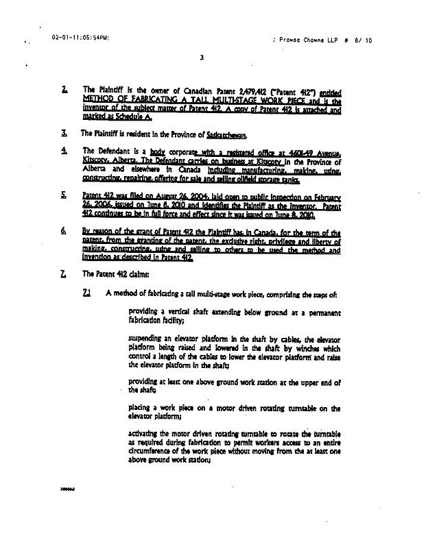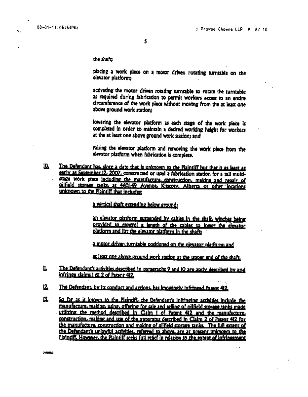 10. The Defendant has, since a date that is unknown to the Plaintiff but that is as [sic] least as early as September 12, 2007, constructed or used a fabrication station for a tall multi-stage work piece including the manufacture, construction, making and repair of oilfield storage tanks, at 4601-49 Avenue, Kitscoty, Alberta or other locations unknown to the Plaintiff that includes: