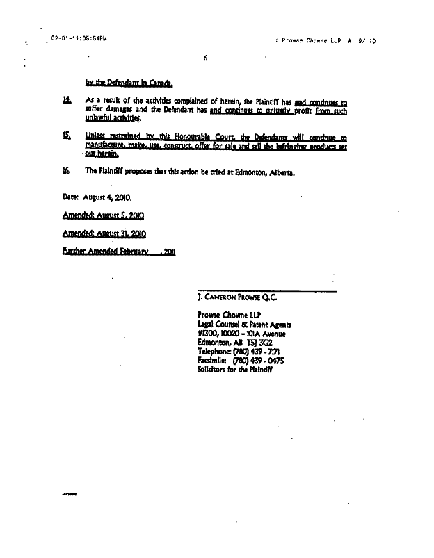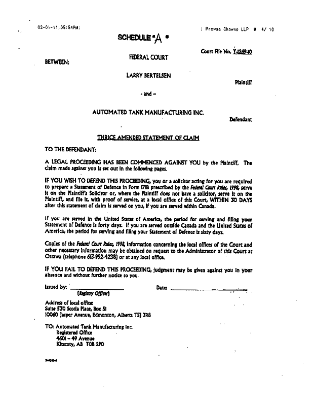 [8] The plaintiff made the motion to amend the statement of claim and on February 7, 2011, the prothonotary allowed the amendments and the thrice amended statement of claim (TASOC) is attached to these reasons as Schedule “A”.