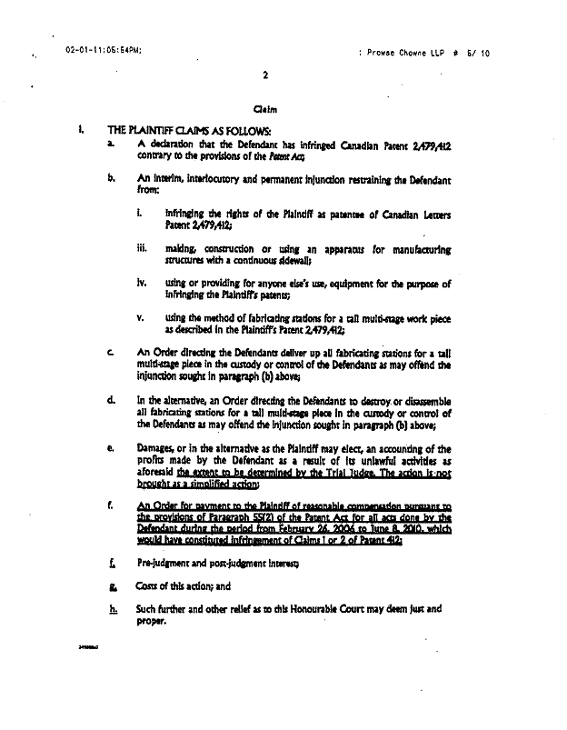 [6] The defendant made a motion to strike the amended amended statement of claim and on November 26, 2010, the prothonotary struck the paragraphs of the amended amended statement of claim dealing with the plaintiff’s interests in the ‘412 Patent and the defendant’s infringement.