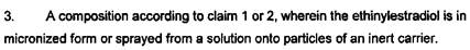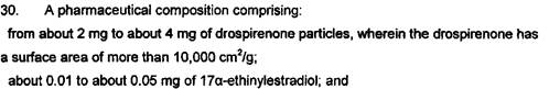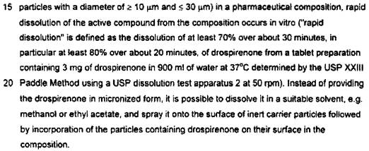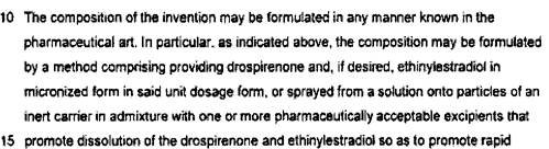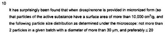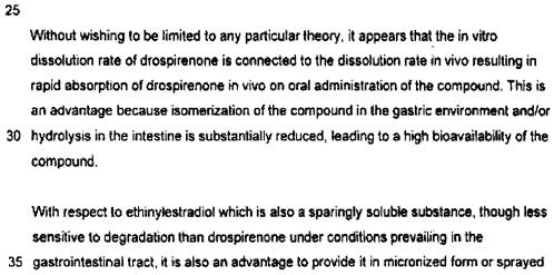[40] A “Detailed Disclosure of the Invention” begins at page 4. It is stated that, to ensure good bioavailability of drospirenone, it should be provided in a form that promotes rapid dissolution. The next paragraph addresses micronization, provides parameters of particle size and distribution, provides dissolution parameters, and indicates that it is possible to provide the product, invalid or micronized, by spraying onto an inert carrier. Without being limited to a particular theory, the patent says that the dissolution rate in vivo may result in higher bioavailability. The ethinylestradiol component may also be micronized or sprayed.