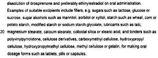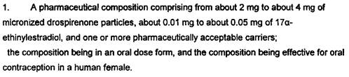 [39] The next section is Summary of the Invention, in which it is stated that a minimum dosage level, and a maximum dosage level, of drospirenone has been determined.