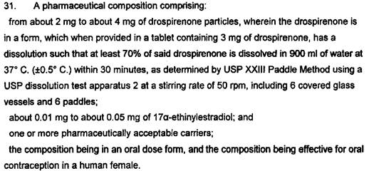 [123] Apotex alleges, in brief, that claim 31 of the ‘426 patent is ambiguous/insufficient because a skilled person could not ascertain whether a composition other than a tablet comprising 3 mg of drospirenone possessed by the dissolution profile required by that claim. In particular, it alleges that claim 31 embraces compositions comprising from about 2 mg to about 4 mg of drospirenone yet the dissolution test described in the patent relates only to 3 mg tablets. Further it alleges that claim 31 embraces compositions including tablet, capsule and liquid dosage forms, yet the dissolution test described in the patent relates only to a tablet.