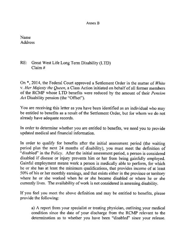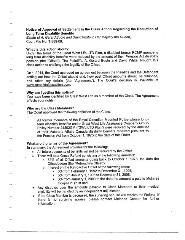 All former members of the Royal Canadian Mounted Police whose long-term disability benefits under Great West Life Assurance Company Group Policy Number 24892GM (“GWL-LTD Plan”) were reduced by the amount of their Veterans Affairs Canada disability benefits received pursuant to the Pension Act from October 1, 1975 to the date of this Order.