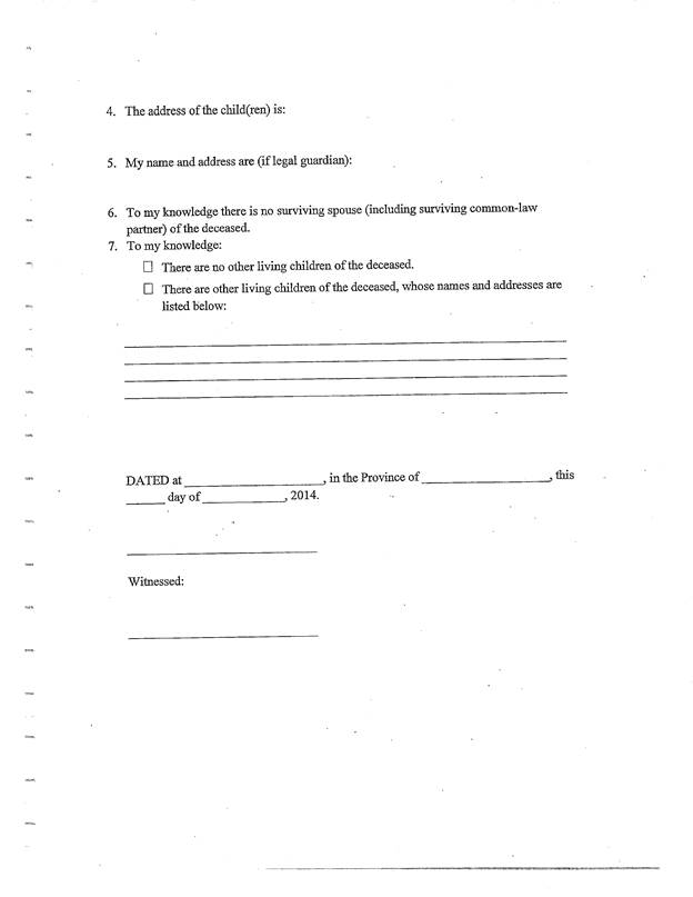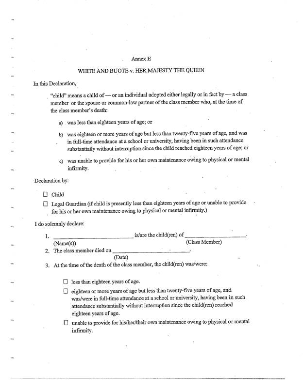 [27] Prospective claimants of payments in respect of deceased Class Members under paragraph 25 shall be required to execute a declaration in the form of Annex D to this Order for Spouses/Common Law Partners or Annex E to this Order for Children.