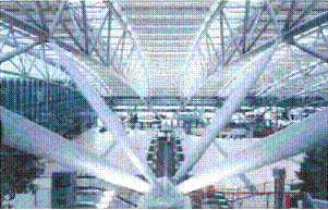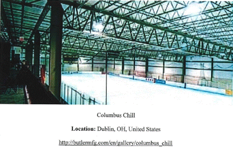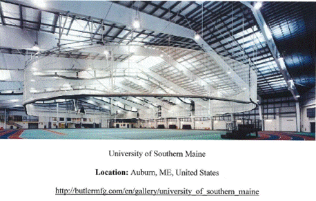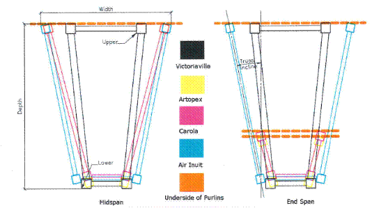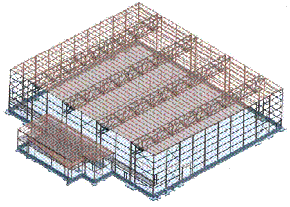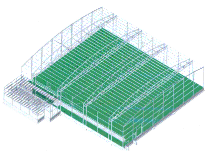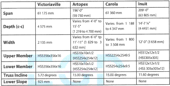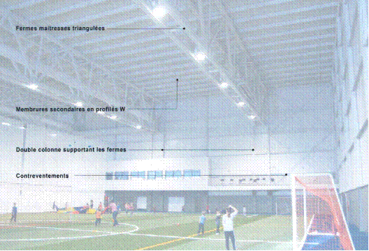 Une superstructure en acier permettant de grandes portées et libérant l’espace de jeux en hauteur (2 poutres par terrain ayant 35 pi libre dessous les poutres et 50 pi libre dessous les poutrelles). M. Viens travaillera de concert avec la compagnie Canam afin de développer le concept structural le plus simple, efficace et économique. L’espace laissé entre les colonnes supportant chacune des poutres sera comblé au niveau de l’enveloppe extérieure par des fenêtres de type mur rideau. Les équipements d’éclairage et de chauffage devront aussi être intégrés aux poutres;