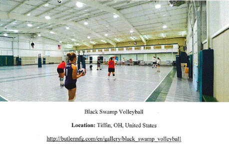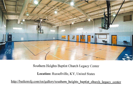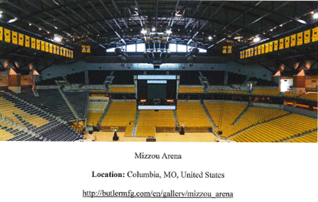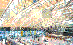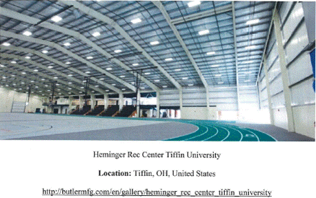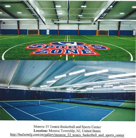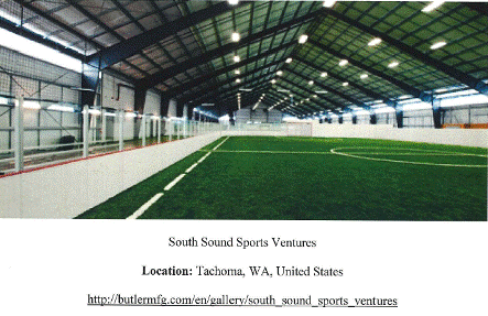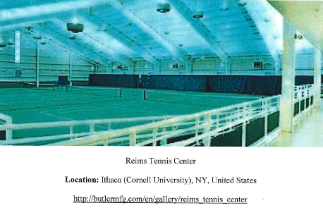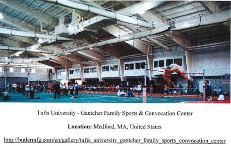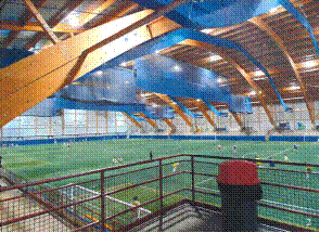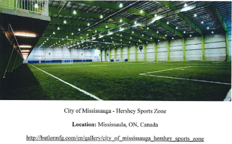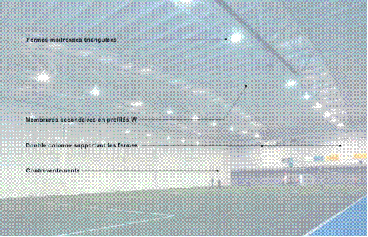 « une superstructure en acier permettant de grandes portées et libérant l’espace de jeux en hauteur (2 poutres par terrain ayant 35 pi libre dessous les poutres et 50 pi libre dessous les poutrelles) »