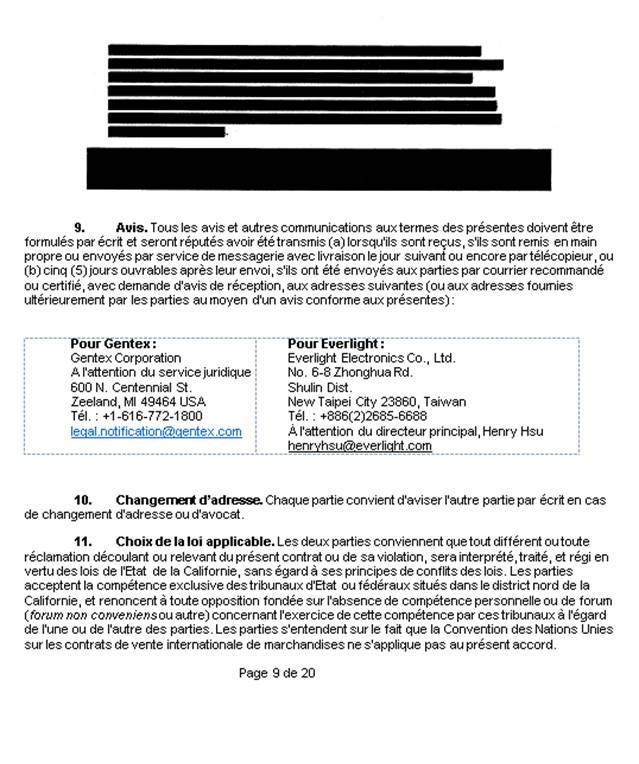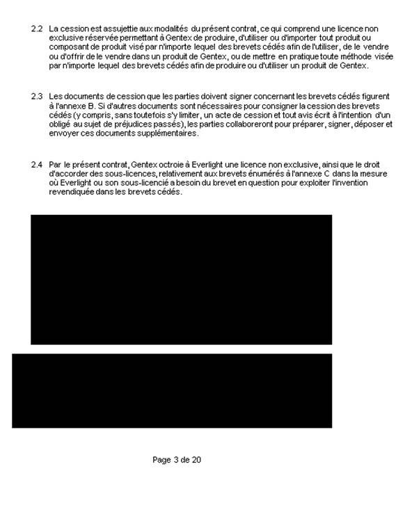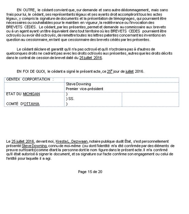 (la cession). Le 13 octobre 2016, l’agent de brevets de la demanderesse a déposé, par inadvertance, le document complet de la cession au Bureau des brevets comme preuve du transfert de propriété du brevet. Or, Gentex et Everlight ont toujours eu l’intention de ne soumettre qu’une version partielle de l’annexe (ci-jointe en tant que pièce C de l’affidavit de Hsien-Chia Lin) et non la transaction complète, afin de protéger leurs renseignements confidentiels. Le 17 octobre 2016, le Bureau des brevets a confirmé l’inscription de la cession au nom de la demanderesse. La demanderesse a déposé la présente demande après avoir remarqué cette erreur.