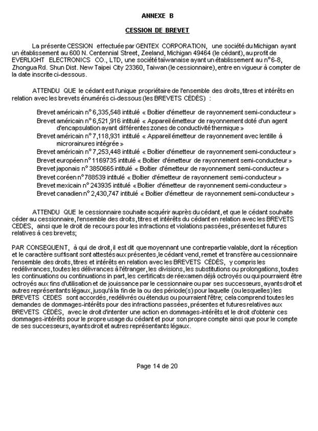 Everlight est un producteur mondial de dispositifs optoélectroniques constitué sous le régime des lois de Taïwan. Le 23 janvier 2002, Gentex Corporation (Gentex), une entreprise américaine du secteur automobile, a déposé une demande de brevet international aux termes du Traité de coopération en matière de brevets pour [traduction] « des appareils émetteurs de rayonnement et leur méthode de fabrication »