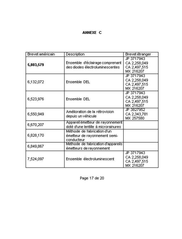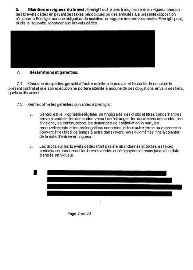 . L’inscription nationale de la demande de brevet au Canada a eu lieu le 5 juin 2003. Le Bureau canadien des brevets a émis les lettres patentes numéro CA 2,430,747 (le brevet) le 20 mai 2008. À la suite d’une transaction à l’échelle mondiale entre Gentex et Everlight, la propriété de plusieurs brevets a été transférée à la demanderesse, dont, entre autres, un contrat de cession intitulé [traduction] « Contrat no A03 16070001 Service juridique d’Everlight »