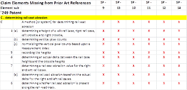 Selon Georgetown, la présente cause se rapporte aux systèmes et aux procédés pour établir l’état de l’usure d’une traverse en bois sous une selle de rail (le brevet 082) et l’état de l’usure d’une semelle de rail ou d’une traverse en béton sous un rail (le brevet 249). Les deux phénomènes ne sont pas visibles lorsqu’ils sont regardés du dessus étant donné qu’ils se produisent sous des composantes qui sont visibles d’au-dessus. Les deux brevets résolvent ce problème en comparant la hauteur de la traverse avec la hauteur d’une autre composante de la voie : la selle de rail et le patin de rail, respectivement. Le brevet 249 comprend également un algorithme pour augmenter l’exactitude du calcul de l’abrasion de l’appui de rail en tenant compte de l’inclinaison.