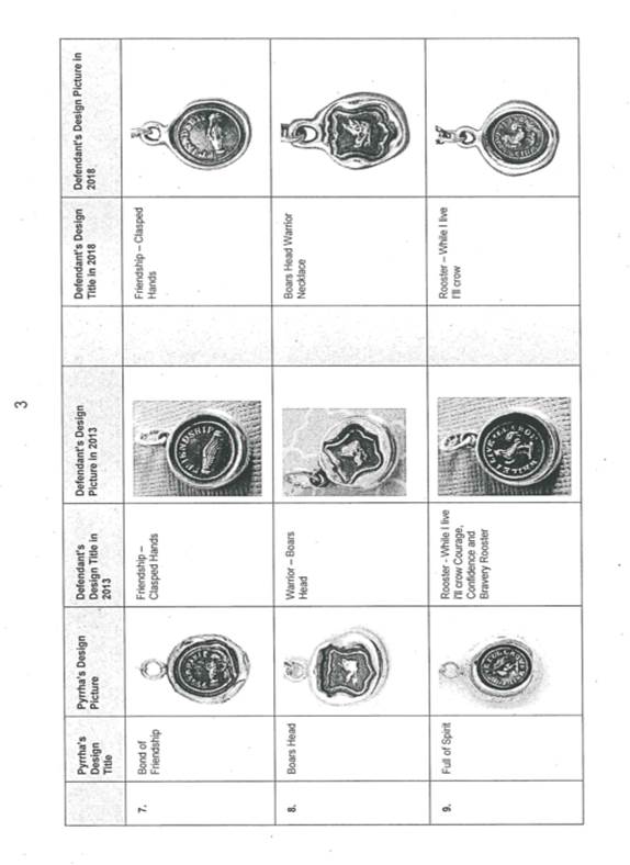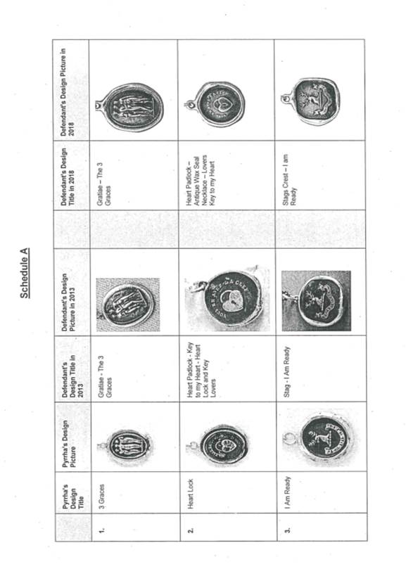 des dessins de Pyrrha. Les différences ne semblent pas avoir été ajoutées superficiellement ou d’une manière qui donne à penser que Mme Hardy dissimulait l’imitation présumée. Les différences sont plus vraisemblablement le résultat de l’utilisation d’images similaires (mais non identiques) provenant de sources distinctes (la propre collection de chaque partie), et du choix de modifier et de finir les bijoux d’une manière légèrement différente.