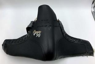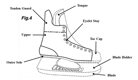 . Il y a habituellement deux quartiers (un de chaque côté du pied), qui sont cousus ensemble à l’arrière de la botte et qui se prolongent vers l’avant, de chaque côté de la botte. Conjointement avec l’embout du patin, la languette et d’autres composants, ils forment ce que l’on appelle l’empeigne de la botte. L’une des figures incluses dans le brevet de Bauer, annotée par l’un des experts de Bauer et indiquant le quartier d’un trait en gras, permet de visualiser ces composants :