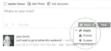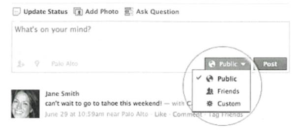 Facebook a avisé le Commissariat pendant notre enquête que la page des « paramètres de confidentialité » permettait aux utilisateurs de restreindre les destinataires des renseignements personnels de leur page de profil et de leurs messages. À la page des paramètres de confidentialité, l’utilisateur avait la possibilité de limiter les destinataires et de préciser si certains sous‑ensembles de données seraient accessibles à tout le monde sur Facebook et en dehors de Facebook (comme « informations publiques »), à ses « amis », à lui seul ou à un « public personnalisé ».