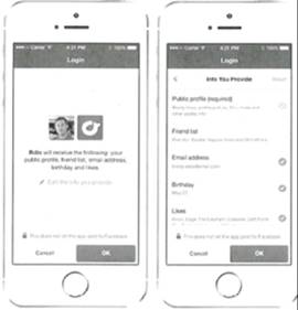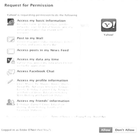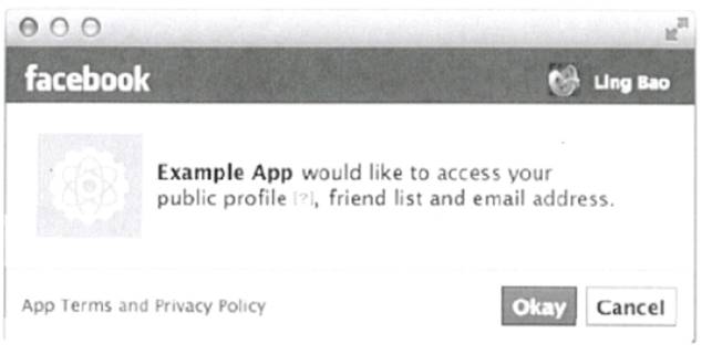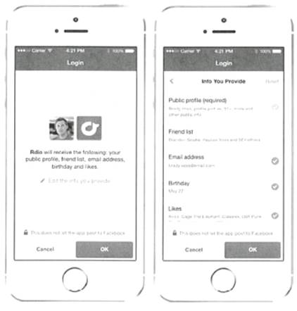 En 2013, lorsqu’un utilisateur installait une application dans Facebook, une boîte de dialogue paraissait qui précisait la nature des renseignements que demandait l’application à l’utilisateur à un niveau qualifié de « granulaire ». Voici un exemple d’une telle boîte de dialogue :