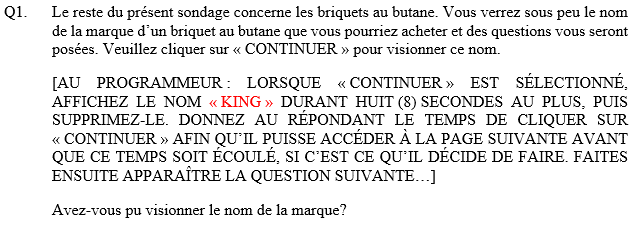 « […] L’entreprise spécialisée dans la recherche a une méthode qui lui permet de savoir combien de temps il a fallu, en moyenne, pour répondre. Et si cette méthode révèle que le temps de réponse est inférieur, ou sensiblement inférieur, à ce temps moyen, elle peut retirer l’entrevue avant même que nous ne l’ayons vue. Et gardez à l’esprit que cette entreprise n’a aucune idée de l’objectif du sondage. Elle mène simplement le sondage en se conformant à certaines règles. »